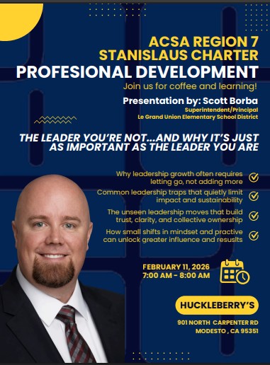 The ACSA Stanislaus Charter invites you to join us for our upcoming Professional Development Program (PDP) Breakfast on February 11th, featuring guest speaker Scott Borba, former Stanislaus County administrator and past ACSA Stanislaus... READ MORE