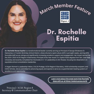 Region 8 is proud to spotlight Dr. Rochelle Espitia, Ed.D., a transformational leader and 2024–2025 ACSA Region 8 Elementary Principal of the Year. From leading rapid culture shifts to dramatically increasing student achievement, her impact reflects what it means to lead with vision, courage, and equity at the center.